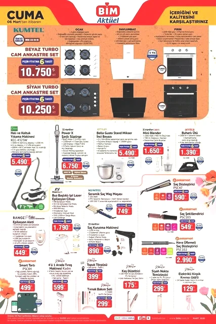BİM'in yeni aktüel ürünler kataloğunun indirimleri açıklandı. 6 Mart Cuma günü, beyaz turbo cam ankastre seti 10.750 TL, siyah model ise 10.250 TL fiyatıyla mutfaklarını yenilemek isteyenlerin beğenisine sunulacak. İşte BİM'in aktüel ürünler kataloğunun detayları